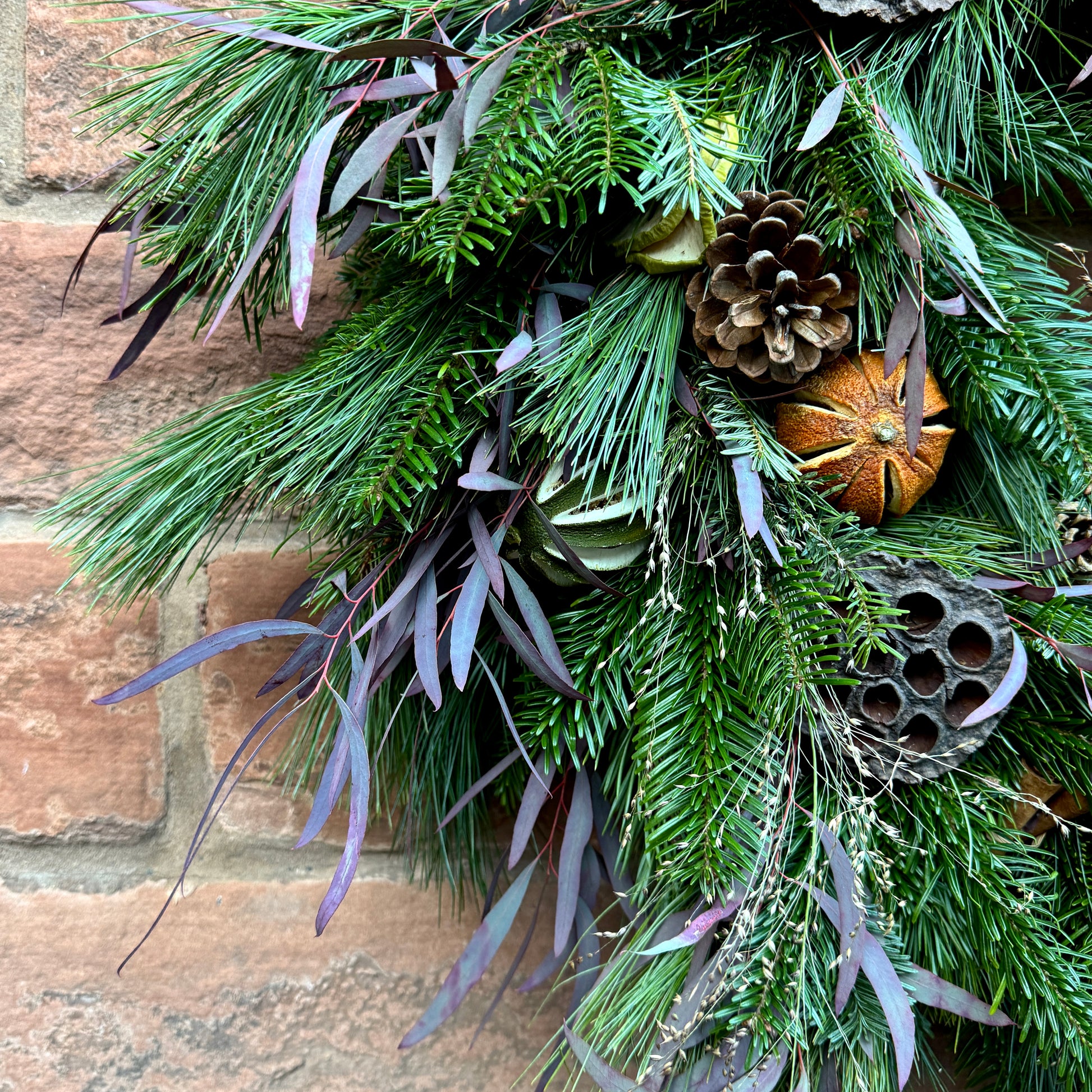 With its signature style, this wreath captures the essence of the season, showcasing a wild and organic aesthetic. Each element is thoughtfully arranged to create a delightful display that not only looks beautiful but also fills your space with the fragrant aroma of seasonal goodies.