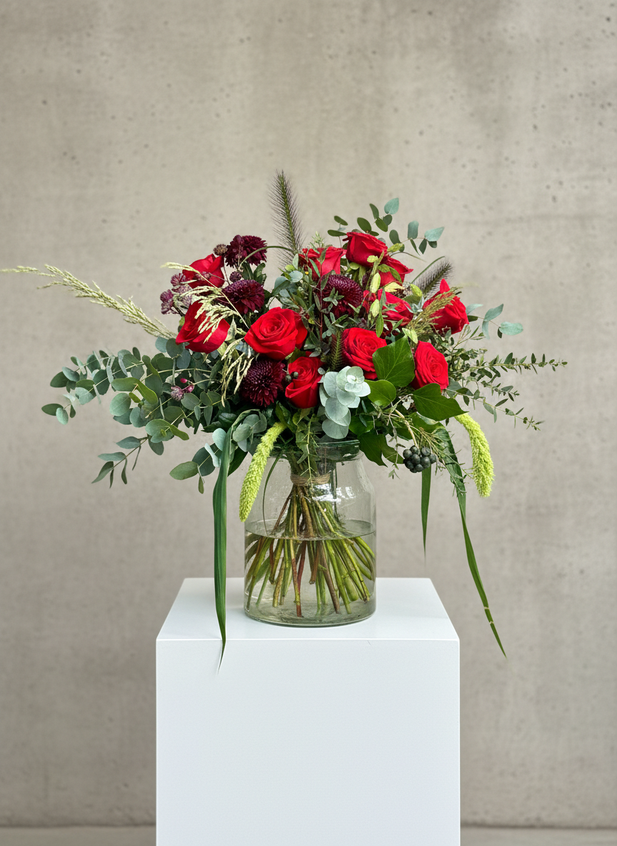 The roses are expertly arranged with lush green foliage and other red and black elements like berries and grasses that enhances their natural beauty and adds a touch of sophistication