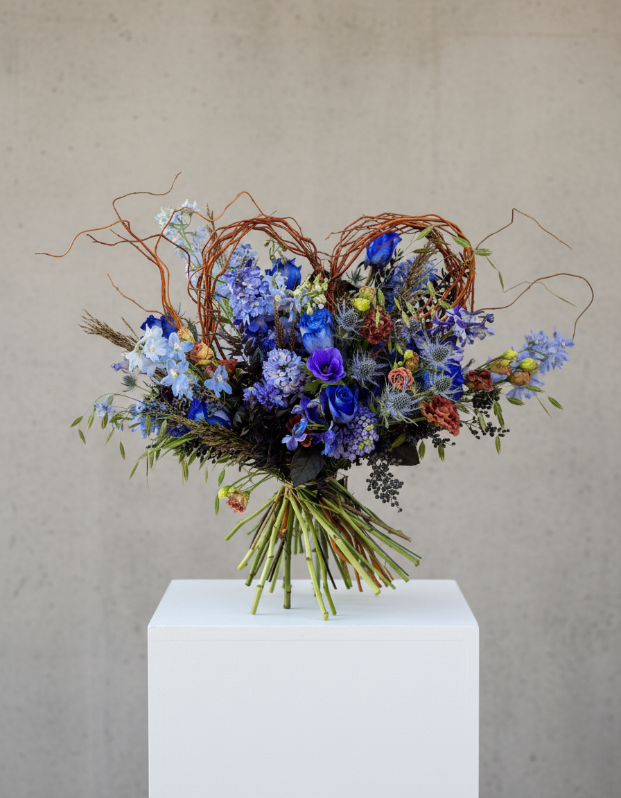 The bouquet features rare blue roses, symbolizing mystery and the unspoken depths of love, beautifully complemented by the bold elegance of Scottish thistle. The sweet fragrance of hyacinth adds an air of fresh romance, while anemones offer a touch of captivating allure. Soft, textured lisianthus brings an element of grace, and blue legustrum provides a serene, lush backdrop. Dark ruskus adds contrast and sophistication, completing this unforgettable floral masterpiece.