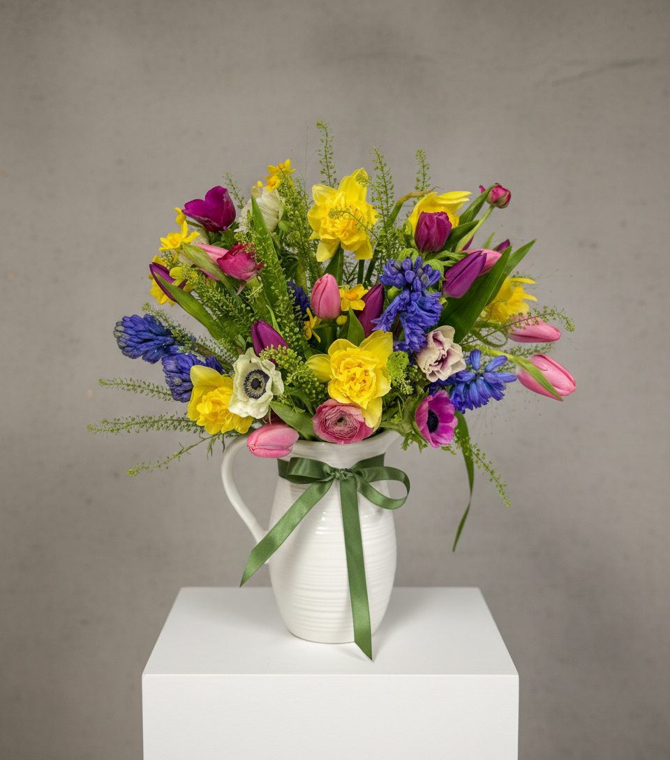 Pictures are representational only and flowers may vary based on seasonal availability. Price includes the ceramic jug.